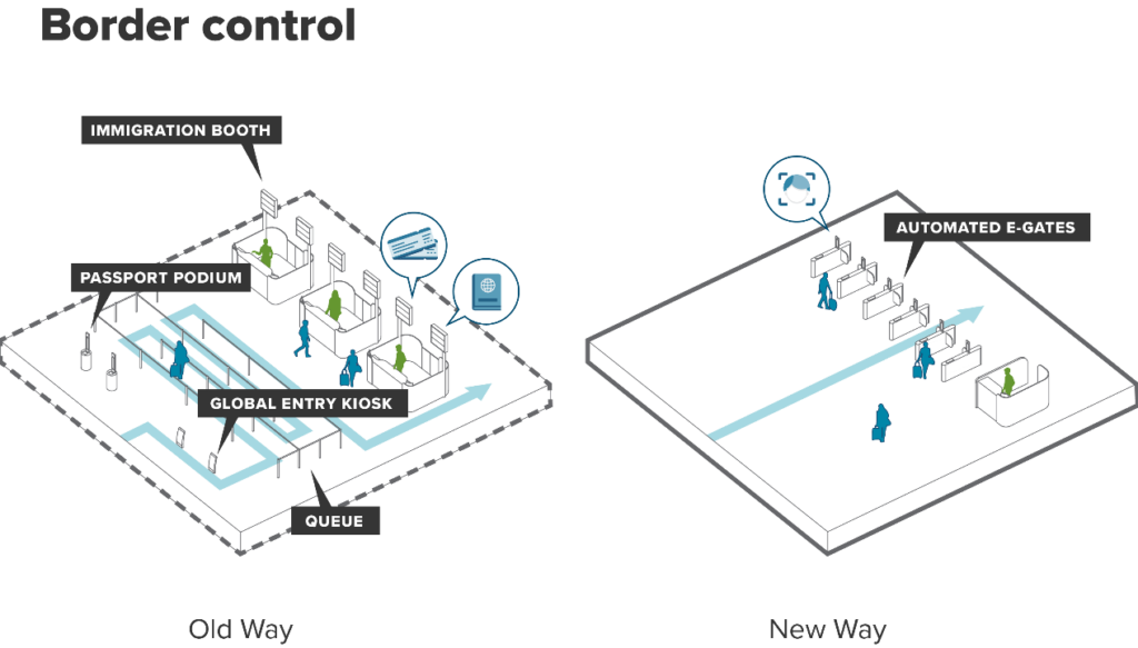 With so many options, airports and airlines are faced with the question in which parts of the passenger or employee journey should the use of biometrics be considered? More specifically, in the use of biometrics in process improvements, airports and their stakeholders are advised to ultimately balance decisions on factors such as the passenger demand, the capacity of their facility, operational requirements and stakeholders, and the level of customer service they wish to attain. Below is an example of how border processing using biometrics can radically change both resources, accessibility, and necessary floor space.